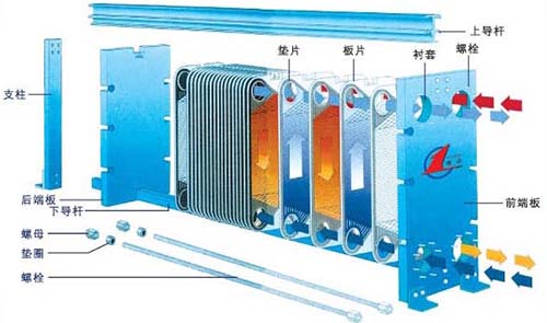 水熱交換器是一組有四個角孔的金屬波紋板,兩種液體(氣體)通過它們進行熱交換。所述金屬板安裝在側邊有固定板和活動壓板的框架內,并用夾緊螺栓夾緊。板上安裝有密封墊片,用于密封油道,并引導油液交替流入相應的油道。波紋板不僅加大了動蕩程度,而且形成了許多支撐點,足以承受媒體之間的壓力差。金屬板和活動壓板掛在上導桿上,由下導桿定位,桿端固定在支撐柱上。